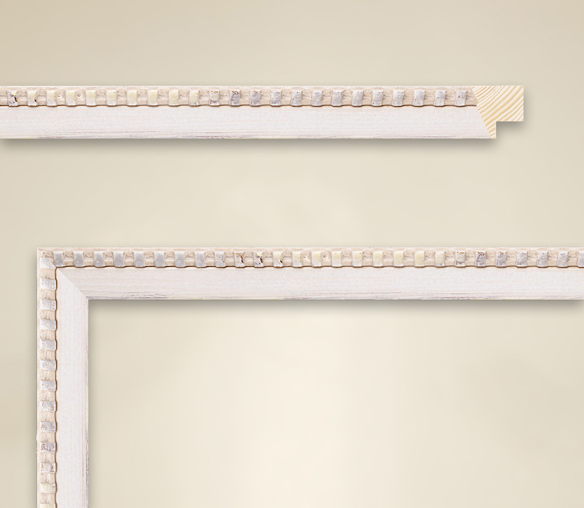 Jemný a křehký rám obrazu Isabel se prezentuje jemnými tvary a barvami. Rám z pravého dřeva o výšce 26 milimetrů vystupuje do místnosti v pravém úhlu a rovině. V místech, kde lišta přechází do šířky, vložili designéři pás drobných ornamentů, načež se lišta na šířku, která měří 21 milimetrů, rovněž šikmo směrem dovnitř zužuje do rovné plochy. Jednoduchost plochých lišt nepřebíjejí ornamenty, ale i ty jsou tak jemné, že rám jako celek zůstává inspirativním doplňkem. Malé obdélníky, které jsou ve vhodných rozestupech seřazeny za sebou, tvoří ozdobnou přední stranu, která dodává rámu zvláštní povrch. Zvolená barva je krásná, čistě sněhově bílá, která ještě více umocňuje světelný charakter. Zatímco na vnitřní straně rámu byly dovedně použity světle červenohnědé oděrky, v ornamentálním pásu je tento barevný odstín opět o něco výraznější. Tímto způsobem se tato lišta také barevně liší od ostatních lišt rámu. |