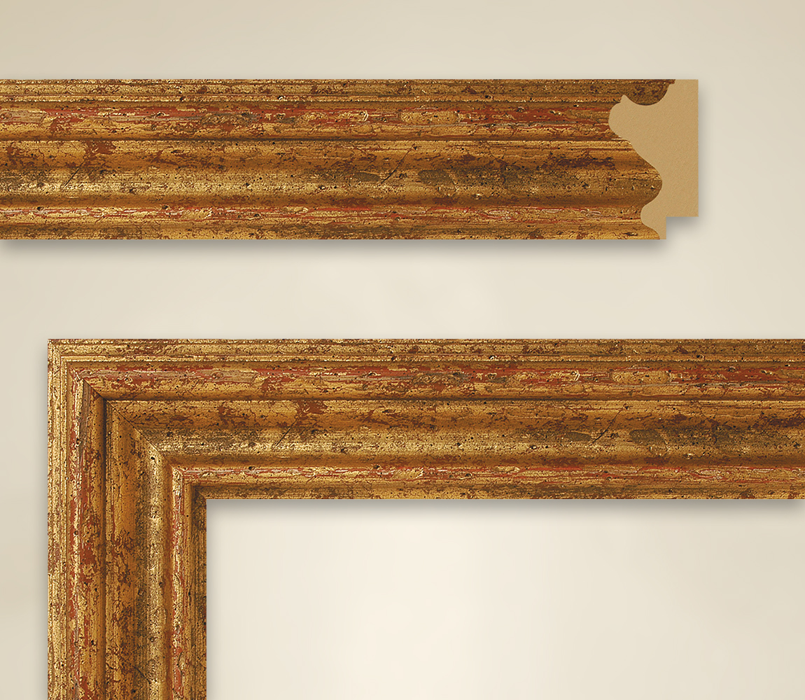 | Zlatý rámeček, který dostojí svému jménu, je rámeček Michela. Kromě barevného provedení přesvědčí tento rám z pravého dřeva také svým tvarem. V tomto případě bylo do rámu začleněno několik typů lišt, které dohromady dávají šířku 57 mm a výšku 37 mm. S filigránovou lištou na nejvzdálenějším konci a následující malou nízkou úrovní se pak zvedá křídlo, které na horním konci rovněž obsahuje velmi úzkou lištu. Po poněkud širší ploše zakřivené směrem dovnitř se rám Michela zastaví s konečným vnějším zakřivením směrem dovnitř obrazu. Umělecký vzhled dřevěné konstrukce je stylově doplněn dobovou zlatou atmosférou. Zlatožlutá barva, nanášená jako tepané zlato, září někdy světlejšími, jindy tmavšími tóny. Barevným leskem se prolínají světle načervenalé i hnědé nuance, které prosvítají zlatem. Toto živé souhvězdí barev vytváří na rámu nádhernou strukturu a dodává mu lehce starobylý charakter. |
