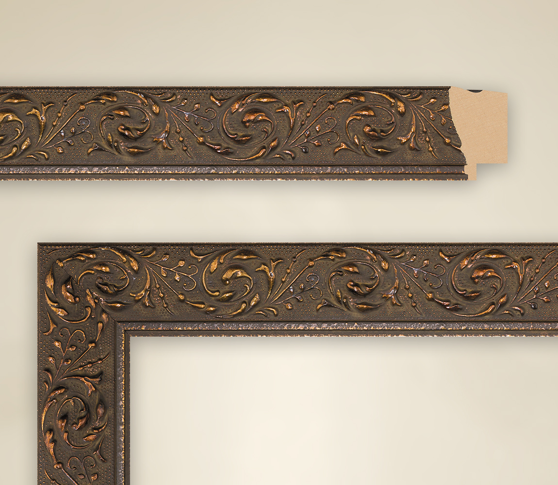 S modelem Minou představuje řada rámů Tapestry bronzový rám s ornamenty, který je jednoduchým, ale přesto působivým rámem pro obrazy, a to jak z hlediska barvy, tak tvaru. Rámeček s tloušťkou 32 mm vystupuje do místnosti až na vnějším okraji v nejvyšším bodě. Jeho celková šířka je 40 mm, na kterou designéři zahrnuli celkem dvě plochy. Většinu horního pohledu zabírá horní silný okraj s ornamenty. Od stěny se tato část obložení z pravého dřeva objevuje jako pero, které se stáčí nahoru a směrem dolů se zplošťuje v mělkém úhlu. Podzemí vykazuje matný design, středně hnědý bronzový odstín, s nímž částečně probleskují světlé nuance. K tomu se přidávají, zpočátku také spíše v pozadí, malé kovové tečky, které připomínají měděnou rytinu a rozprostírají nádhernou strukturu. Stejně jako ostatní ozdoby, které se k nim připojují, dostaly lesklou světle bronzovou barvu. Designéři zde zvolili květinové prvky, které ukazují velmi filigránské úponky, jejichž konce tu a tam končí cibulovitými poupaty. Přesto zůstává jejich celkový vzhled velmi jemný, protože mezi vazbami je umně ponecháno velké množství vzduchu. Závěr interiéru obrazu tvoří úzká jednoduchá dvojitá lišta. |