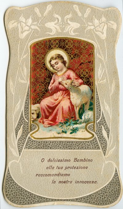 Zbožný obraz: Holčička v šatech pro přijímání obětuje své srdce Panně Marii. "" Nabídnout své srdce Marii, z jakých ctností ho zdobíš, jsi sladký, skromný, dobročinný""" Karta Dentelee. 19. století. Soukromá sbírka