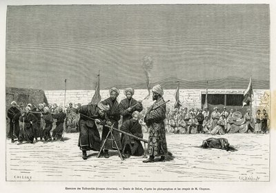 Cvičení manipulace s puškami Taifourchi, jednotky vyzbrojené a vycvičené čínskou armádou, kresba od Delorta, pro ilustraci vzpomínek na anglické velvyslanectví v Kachgaru (nebo Kashi, Čína) v letech 1873-74 od pana Chapmana a Gordona. Rytina v Le t