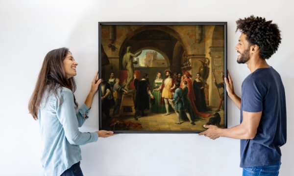 Francouzský král František I. (1494-1547) navštíví studio Buenvenuto Cellini (1500-1571) v Římě. Malíř daruje králi sochu svatého Jana Evangelisty Anonymní obraz. Roma, Galleria Nazionale d'Arte Moderna (Řím, Národní galerie A