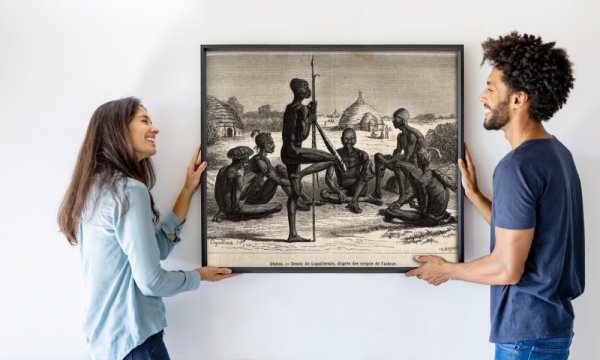 Dinkas z vesnice Koudj (Senegal), jehož tělo je pokryto popelem, aby je chránil před hmyzem a parazity, je také kosmetickým a společenským prvkem, vyrytým podle Laguillermieho kresby, znázorňující cestu do srdce Afriky v letech 1868-1871