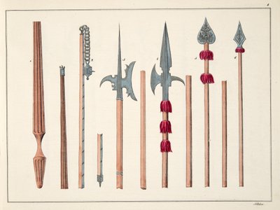 Luky a šípy ze 14.-15. století, deska z knihy "A History of the Development and Customs of Chivalry", autor Dr. Franz Kottenkamp, vydáno Carlem Hoffmannem, 1842.