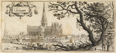 Dvě postavy stojící u velkého stromu na pravé straně v popředí; město Chichester v dálce; městské hradby procházející scénou; Chichesterská katedrála uprostřed obrazu, cca 1660 (lept)