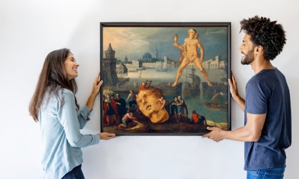 Sedm divů světa: „Rhodský kolos“ (Colosso di Rodi) Obraz Louise de Caulleryho (známého jako Mistr Knihy skic Leningradu) (kolem 1580 – po 1621) Slunce 17. století. 0,35x0,46m