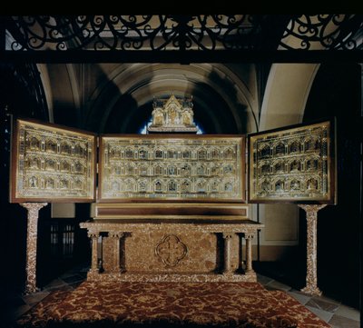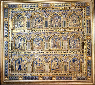 Verdunský oltář vyrobený ve zlatě a smaltu od Nicolase de Verdun (cca 1130/50-1205): scény ze Starého a Nového zákona (přechod přes Rudé moře, král Melchisedech (Melchisedech nebo Melchisedech nebo Melkisedeq nebo Melki-Tsedeq nebo Melki Tsedeq) , křest Kr