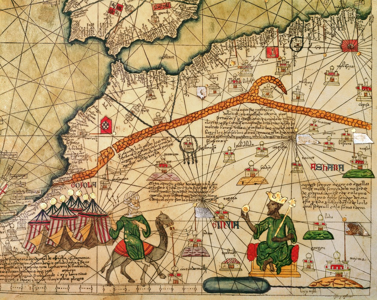 Detail kopie katalánské mapy Evropy a severní Afriky, darované Karlu V. Francouzskému v roce 1381(Detail of Copy of a Catalan Map of Europe and North Africa, presented to Charles V of France in 1381 )Abraham Cresques |