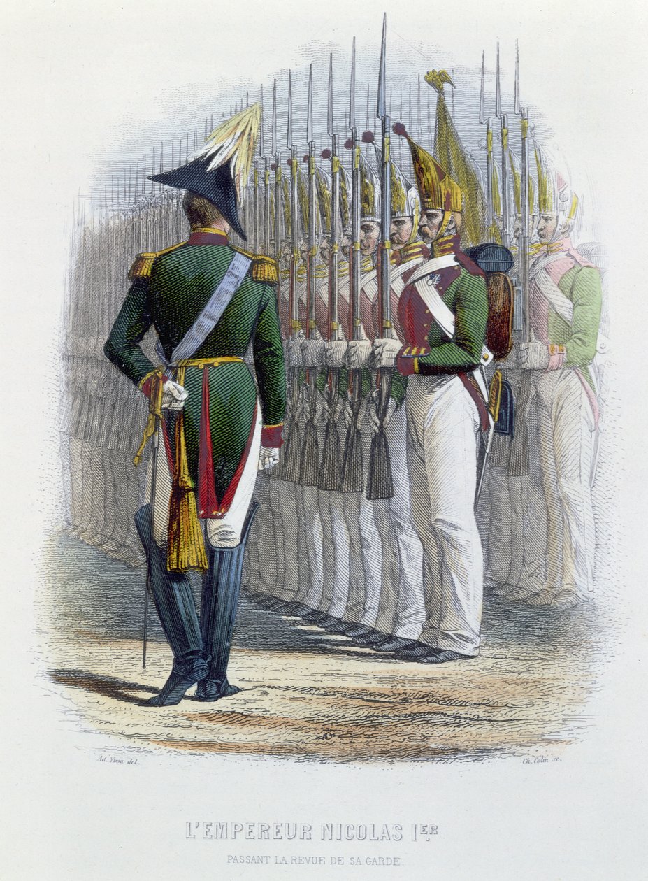 Car Nikolaj I. Ruska kontroluje své stráže stojící v pozoru(Tsar Nicholas I of Russia inspecting his guards standing to attention )Adolphe Yvon |