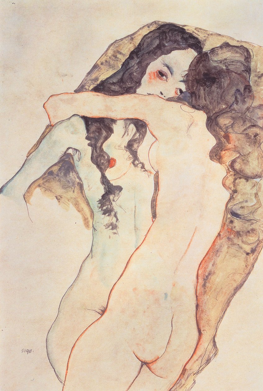Rakouský malíř Egon Schiele svým zobrazením milostného aktu mezi dvěma ženami opět dostál své pověsti enfant terrible domácí umělecké scény. Současně znovu potvrdil, že je jedním z největších mistrů expresionismu. Dílo z roku 1911 zobrazuje dvě ženy ležící v intimním objetí. Oba jsou nazí. Žena v pravé části obrazu odvrátila tvář od diváka a tiskne ji k druhé ženě, která se na diváka dívá, aniž by ho vnímala. Její oči vyjadřují vyčerpání po intenzivním, zkreslujícím milování. Umění Egona Schieleho nezobrazuje sexualitu idealisticky, nezastírá ji ani neskrývá za náznaky. V Rakušanových dílech se naplno projevuje emocionální dopad fyzické lásky, prvotní, syrové a smrtelné. Zobrazení dvou nahých žen v objetí vyjadřuje hlubokou erotiku vymykající se společenským normám. Období kolem roku 1911, kdy toto dílo vzniklo, bylo pro Egona Schieleho obtížné a poznamenané odmítáním. Obyvatelé vesnice, kde v té době žil, ho vyhnali kvůli jeho tolerantnímu umění a životnímu stylu, který považovali za hříšný. Později dokonce strávil několik dní ve vězení. Obvinění: přestupek proti veřejným mravům.