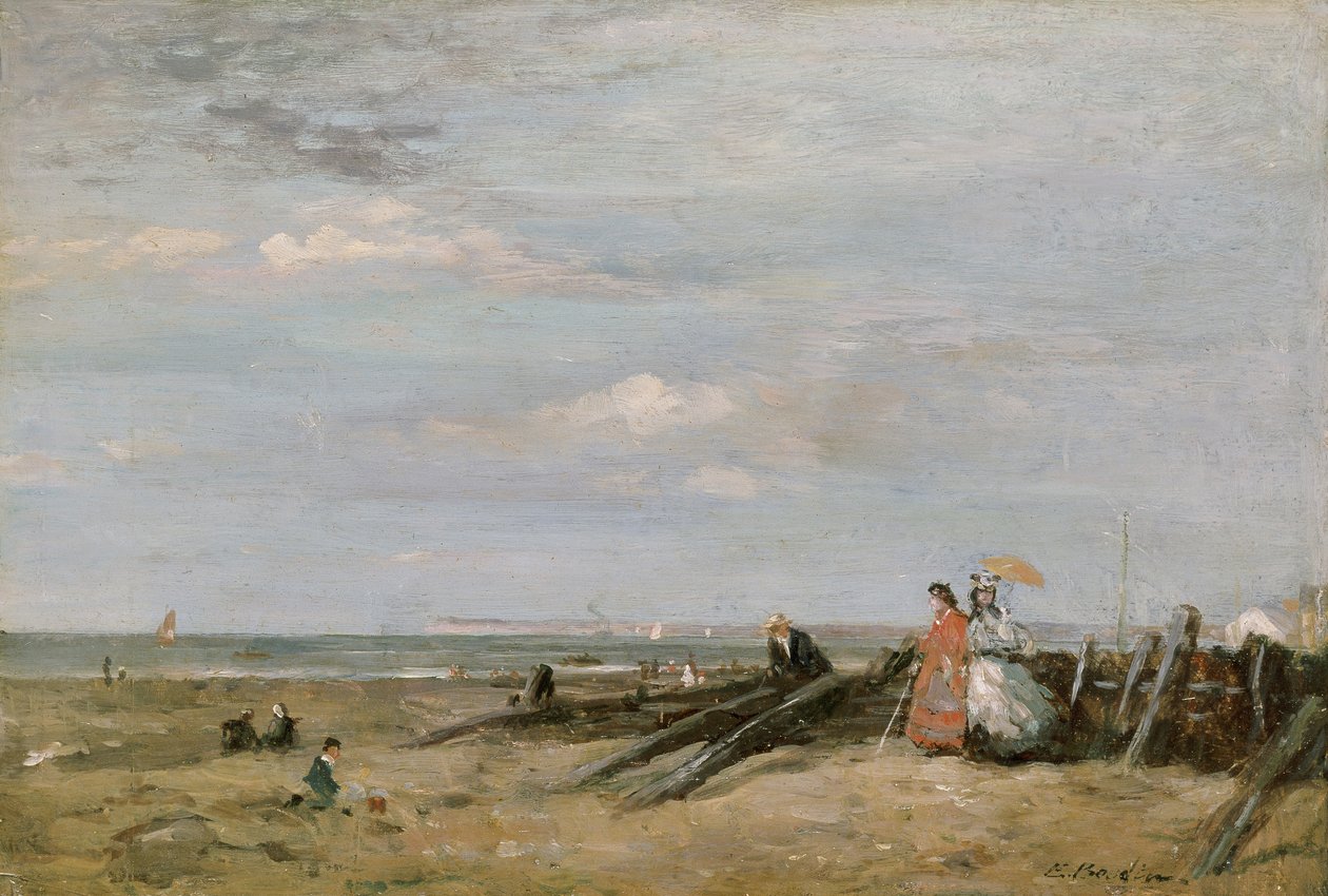 Plážová scéna v Trouville, 60. léta 19. století (olej na kartě položené na desce)(A Beach Scene at Trouville, 1860s (oil on card laid on panel))Eugene Louis Boudin |