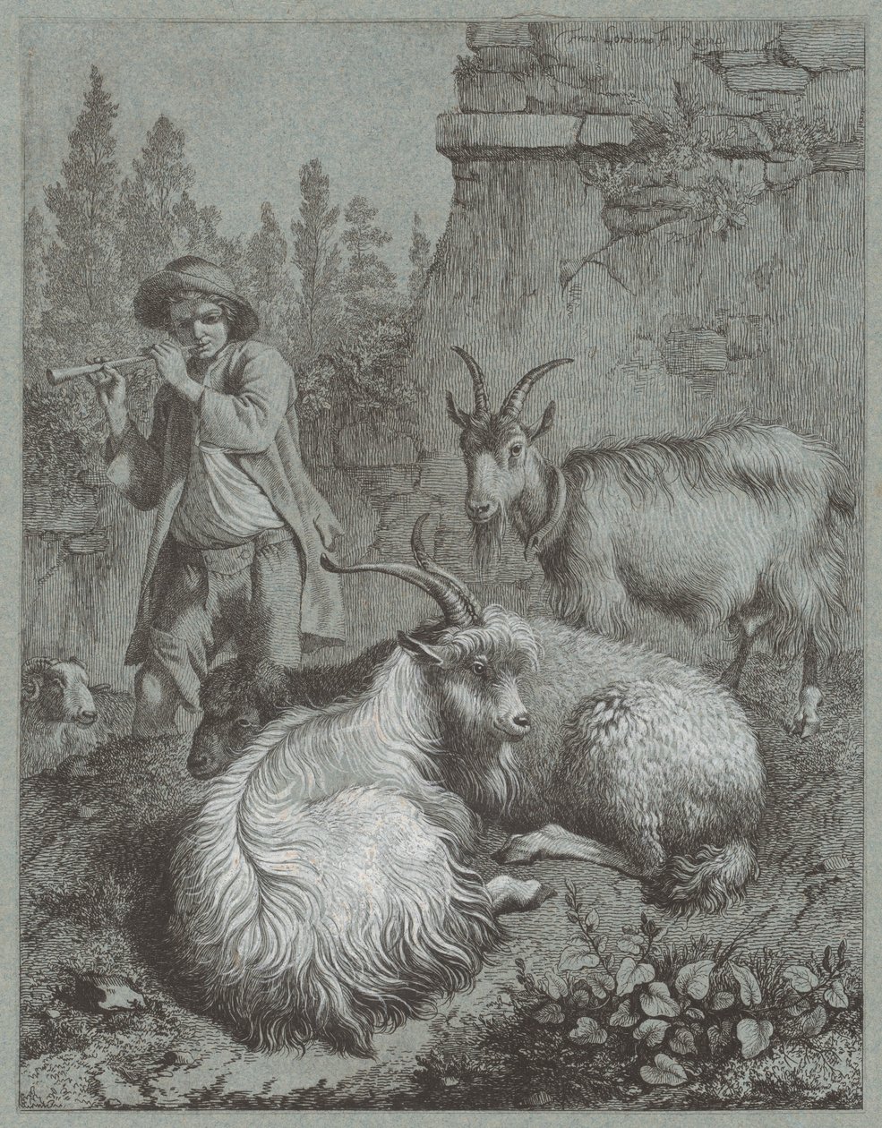 Pastýř hrající na flétnu s kozami(Shepherd Playing a Flute with Goats)Francesco Londonio |