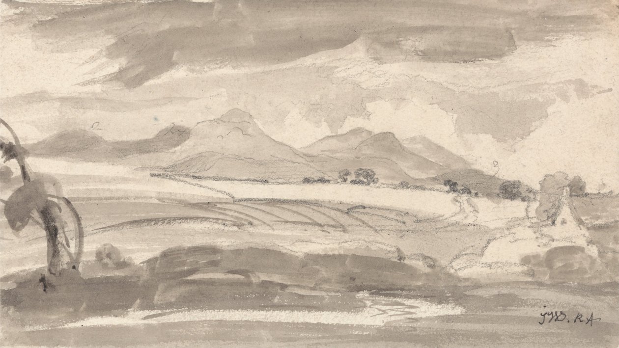 Pohled s výhledem na pole do vzdálených hor s chatkou vpravo(View Overlooking Fields to Distant Mountains, with a Cottage at Right)James Ward |