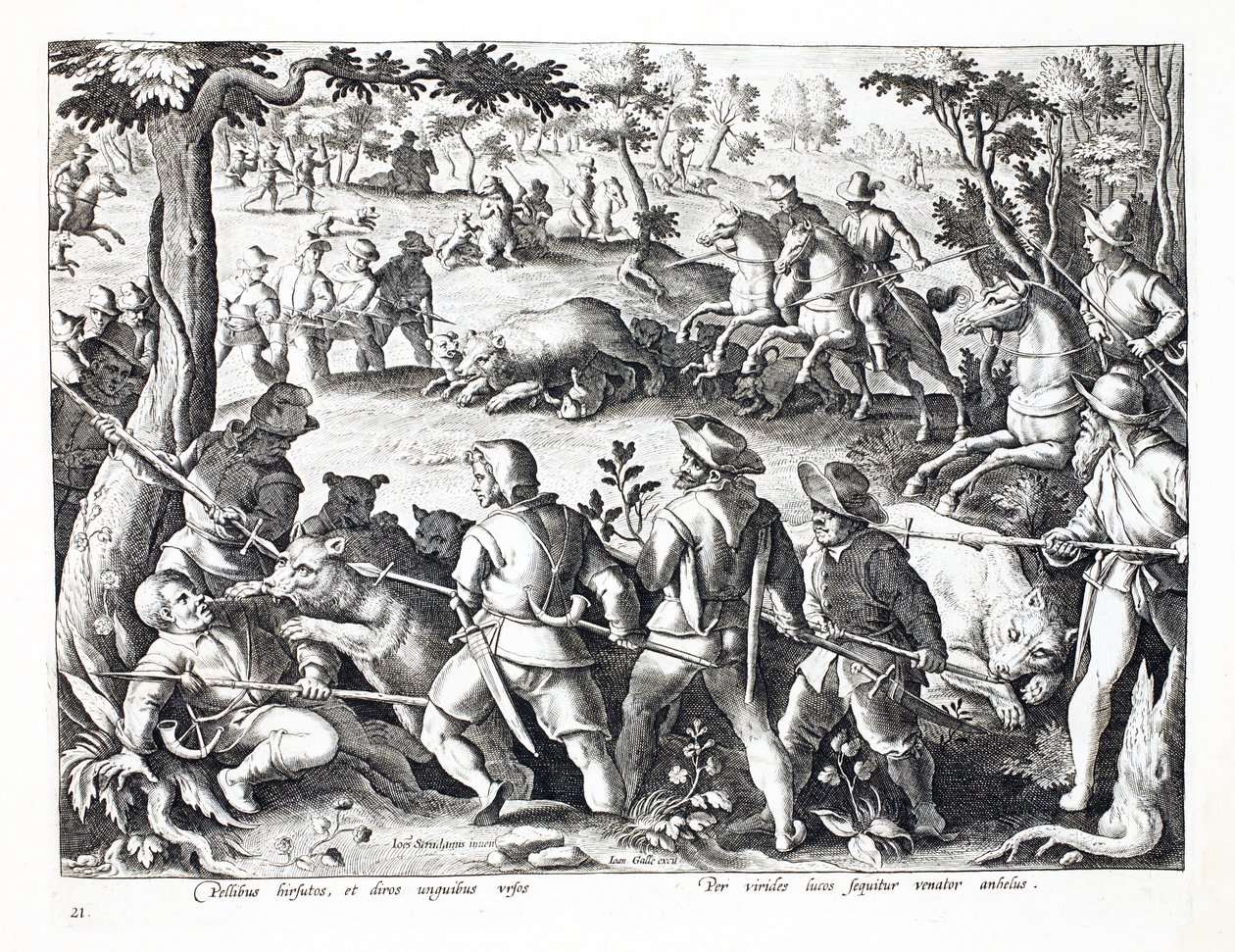 Lov na medvědy se psy a oštěpy, ilustrace z 'Venationes, Ferarum, Avium, Piscium' (Lovu: divoká zvěř, ptáci, ryby), ryl Jan Collaert (1566-1628), pub. od Phillipus Gallaeus, Ams(Bear hunting with dogs and spears, illustration from 'Venationes, Ferarum, Avium, Piscium' (Of Hunting: Wild Beasts, Birds, Fish), engraved by Jan Collaert (1566-1628), pub. by Phillipus Gallaeus, Ams)Jan van der Straet |