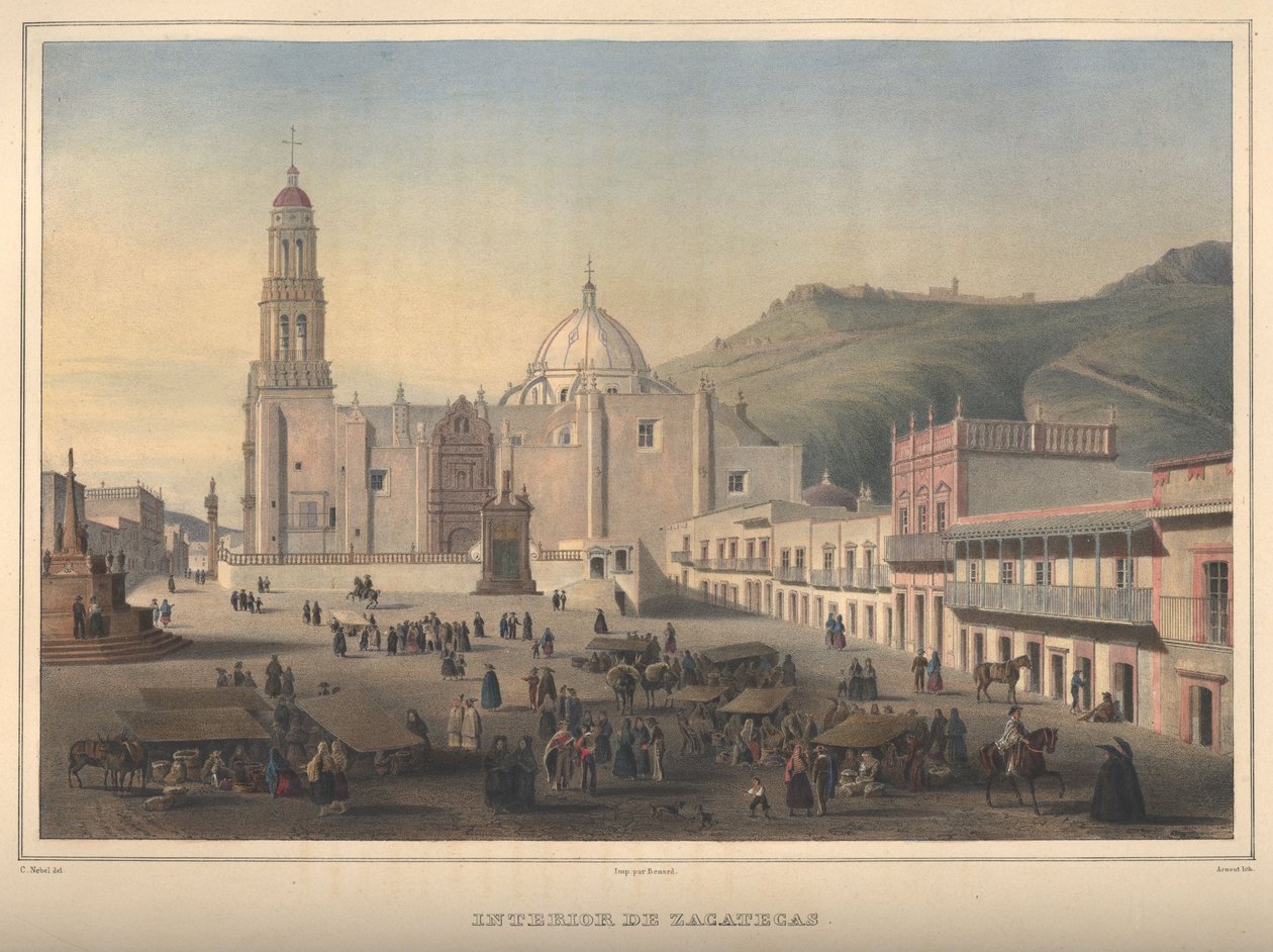 Interiér de Zacatecas, pohled na Zacatecas, Zacatecas. Ručně kolorovaná litografie zvýrazněná arabskou gumou.(Interior de Zacatecas, view of Zacatecas, Zacatecas. Hand-colored lithograph highlighted with gum arabic. )Jean-Baptiste Arnout |