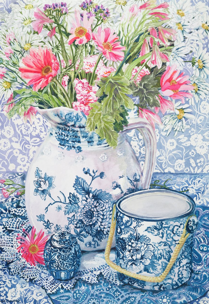 Gerbery v džbánu Coalport s modrými hrnci(Gerberas in a Coalport Jug with Blue Pots )Joan Thewsey |