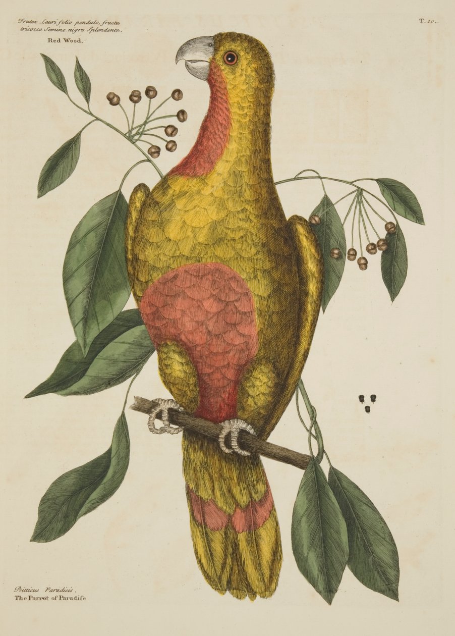 „Papoušek ráje“, z Přírodní historie Karolíny, Floridy a Bahamských ostrovů, 1731(‘The Parrot of Paradise’, from The Natural History of Carolina, Florida and the Bahama Islands, 1731)Mark Catesby |
