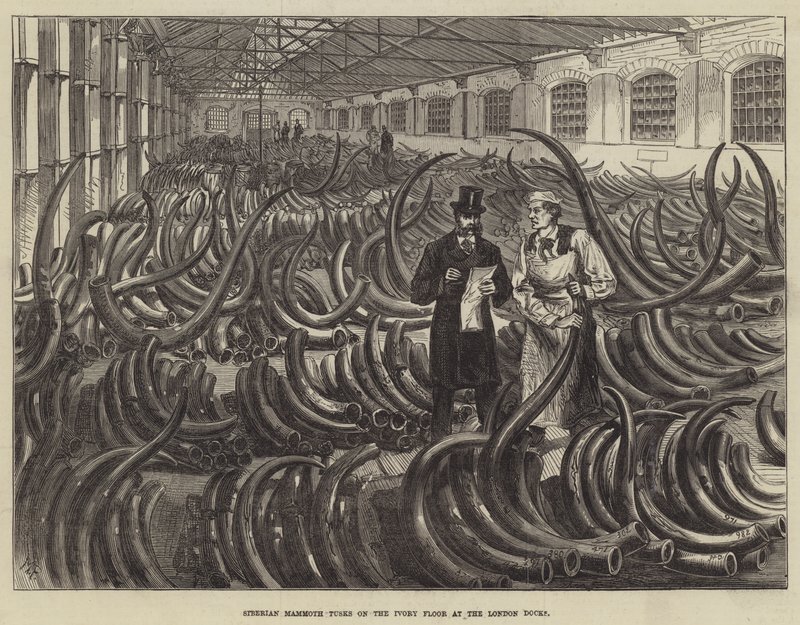 Sibiřské mamutí kly na podlaze slonoviny v londýnských docích(Siberian Mammoth Tusks on the Ivory Floor at the London Docks )Melton Prior |
