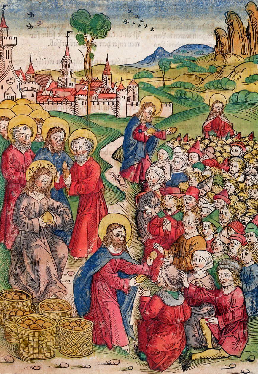 Rozmnožení chlebů a ryb, 1491 (barevný dřevoryt)(The Multiplication of Loaves and Fishes, 1491 (colour woodcut))Michael Wolgemut |