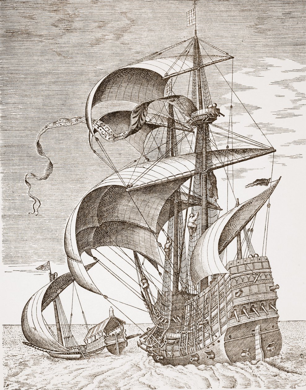 Ozbrojený třímistr na otevřeném moři v doprovodu lodní kuchyně z 'The Sailing Vessels', vyryté Fransem Huysem (1522-1562), vydal Hieronymus Cock, Antverpy, c.1560-65(Armed Three-Master on the Open Sea Accompanied by a Galley from 'The Sailing Vessels', engraved by Frans Huys (1522-1562) published by Hieronymus Cock, Antwerp, c.1560-65 )Pieter Bruegel the Elder |