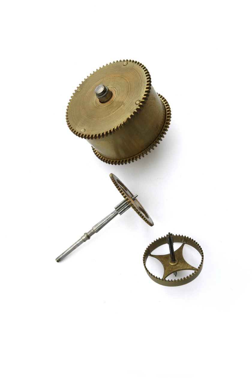 Jedoucí vlak a pružinový sud stolních hodin, cca 1660 (mosaz)(The going train and spring barrel of a table clock, c.1660 (brass))Pieter Visbach |