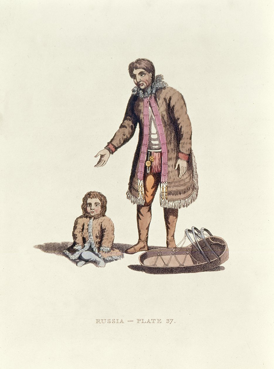 Samojed žena s dítětem a kolébkou z Dress of the Russ, 1814(Samoyed woman with her baby and a cradle from Dress of the Russians, 1814 )William Alexander |